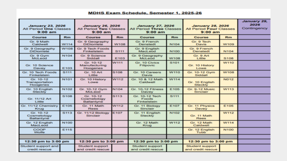 MDHS 25/26 Semester 1 Final Exam Schedule